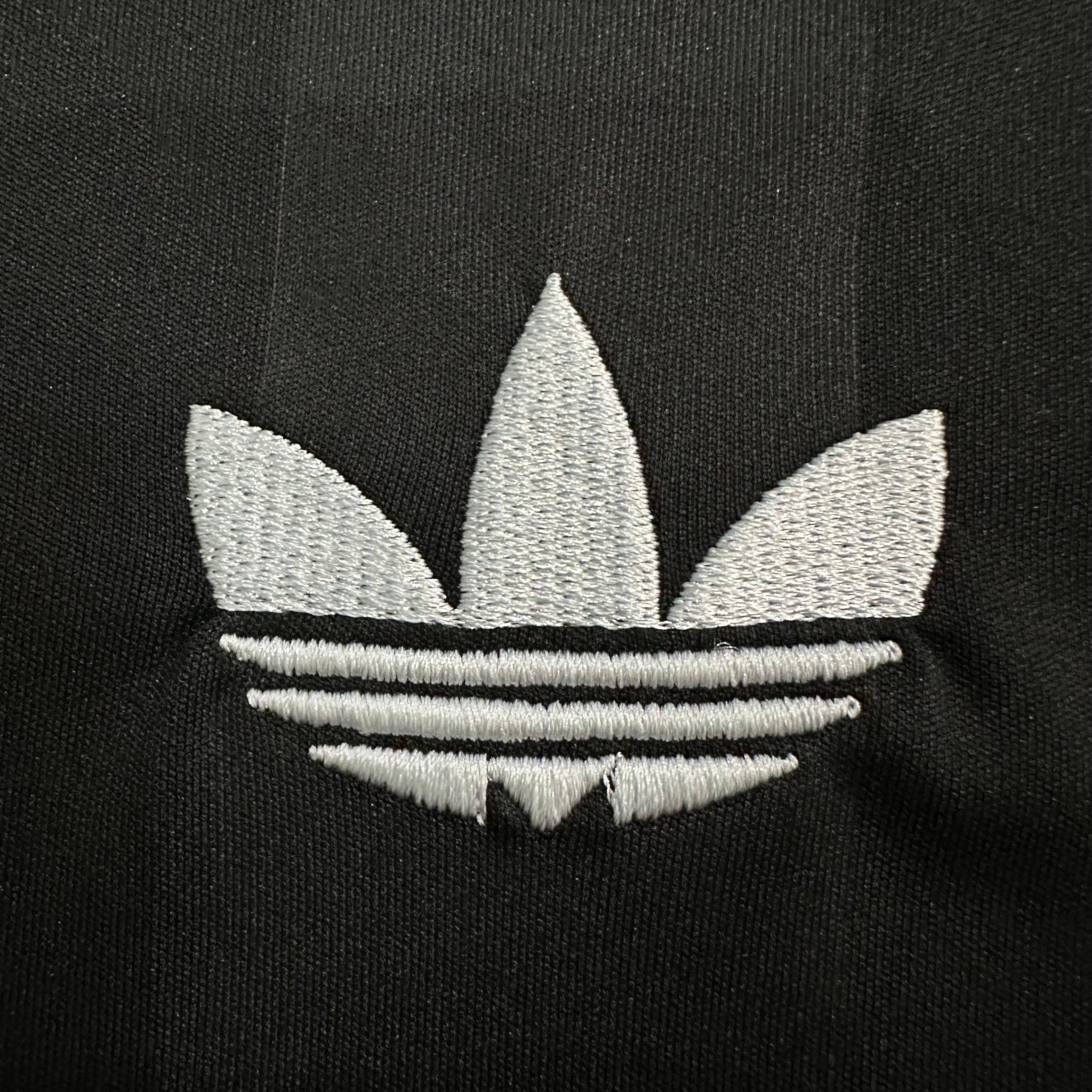 - Design: All-black with subtle shadow stripes and a white crew neck collar. Features Adidas Trefoil logo.